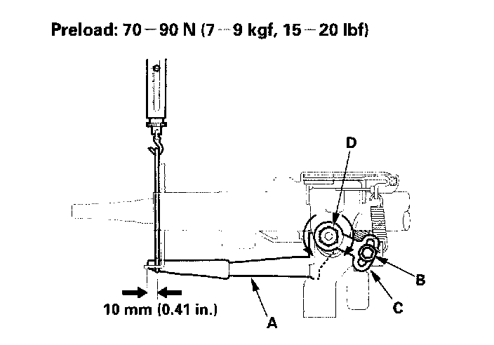 1. Move the tilt lever (A) from the loose position to the lock position three to five times. With the tilt lever in the loose position measure the tilt lever preload 10 mm (0.4 inch) from the end of the tilt lever.