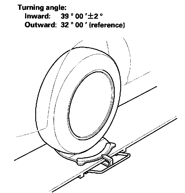 1. Turn the steering wheel fully to the right and left while applying the brakes, and check the turning angles of both front wheels. If the turning angle is not within the specification or the inward turning angles differ between the right and left side, go to step 2.