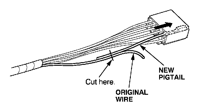 6. Lay the pigtail and the original wire side-by-side, and cut off both ends at once. If you are making more than one splice, do not cut each pigtail at the same location; the resulting "lump" of splice connectors would interfere with rewrapping the harness. Instead, cut the first pigtail close enough to the terminal so you will have room to make each remaining cut about 20 mm (3/4 inch) farther down on the next pigtail.