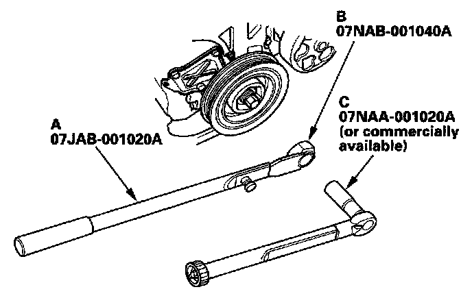 Install the crankshaft pulley, and hold the pulley with holder handle (A) and holder attachment (B).