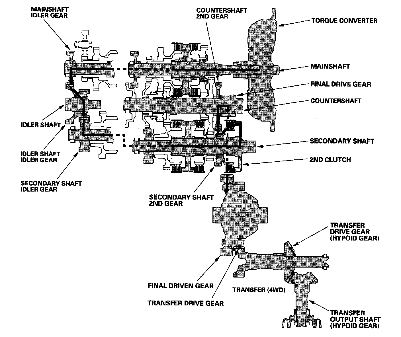 ^ Hydraulic pressure is applied to the 2nd clutch, then the 2nd clutch engages the secondary shaft 2nd gear with the secondary shaft.