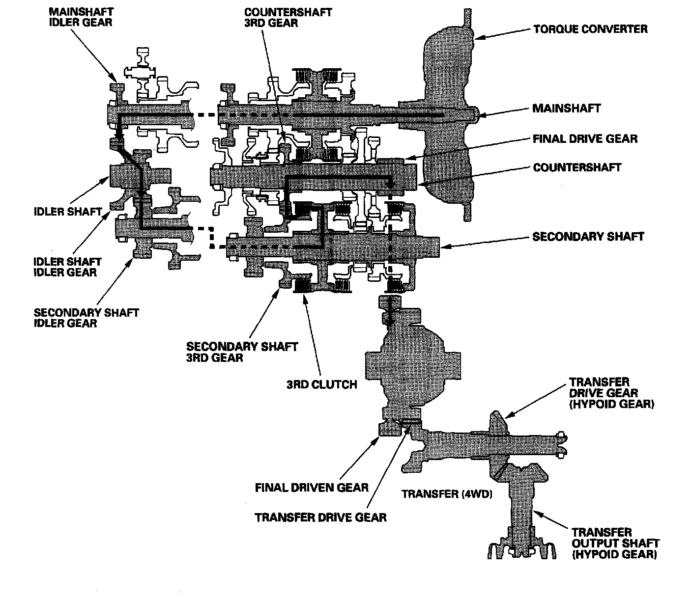 ^ Hydraulic pressure is applied to the 3rd clutch, then the 3rd clutch engages the secondary shaft 3rd gear with the secondary shaft.