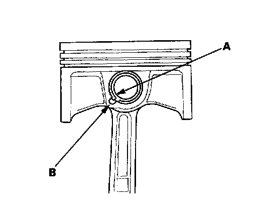 2. Apply new engine oil to the piston pin snap rings (A), and turn them in the ring grooves until the end gaps are lined up with the cutouts in the piston pin bores (B).