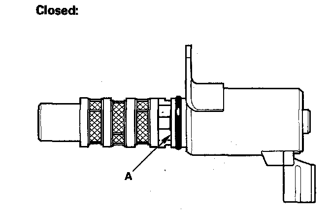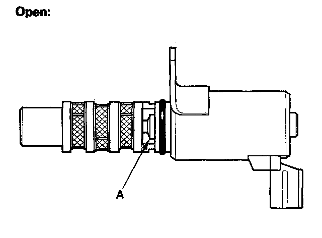 6. Connect the battery negative terminal to VTC oil control solenoid valve 2P connector terminal No.1. Appearance of inner valve (A) in the port should be at least 1/16 in. (1.2 mm). If the inner valve does not open, replace it; then go to step 7.