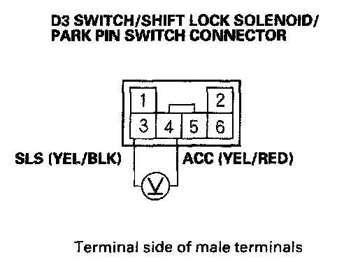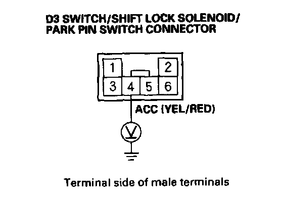 8. Measure the voltage between D3 switch/shift lock solenoid/park pin switch connector terminal No. 4 and body ground.