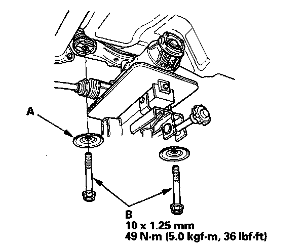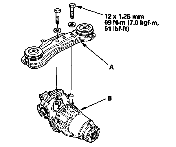5. Install the plates (A); and torque the rear differential mount assembly mounting bolts (B).