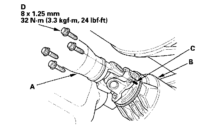 8. Install the No. 2 propeller shaft (A) onto the rear differential (B) by aligning the reference marks (C) made during removal. Make sure you use new mounting bolts (D).