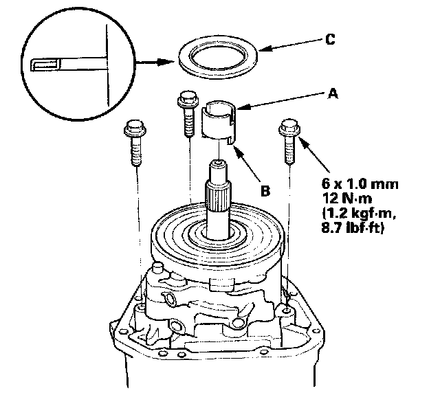 5. Align the tab (A) of the pressure plate with the groove (B) of the oil pump drive shaft, then install the pressure plate (C) on the oil pump assembly.
