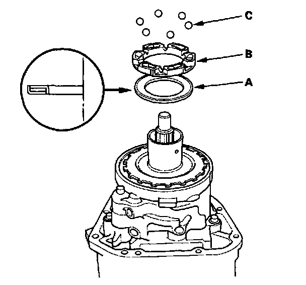 6. Install the thrust needle bearing (A), the base cam (B), and the six steel balls (C).