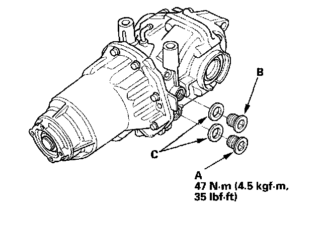 13. Install the drain plug (A) and the oil filler plug (B) with new washers (C).