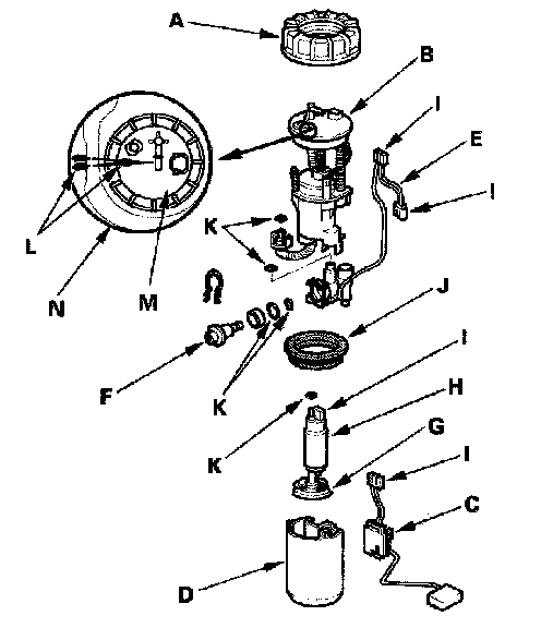 11. Install the parts in the reverse order of removal with a new base gasket (J), new locknut (A), and new O-rings (K). When installing the fuel tank unit, align the marks (L) on the unit (M) and the fuel tank (N).