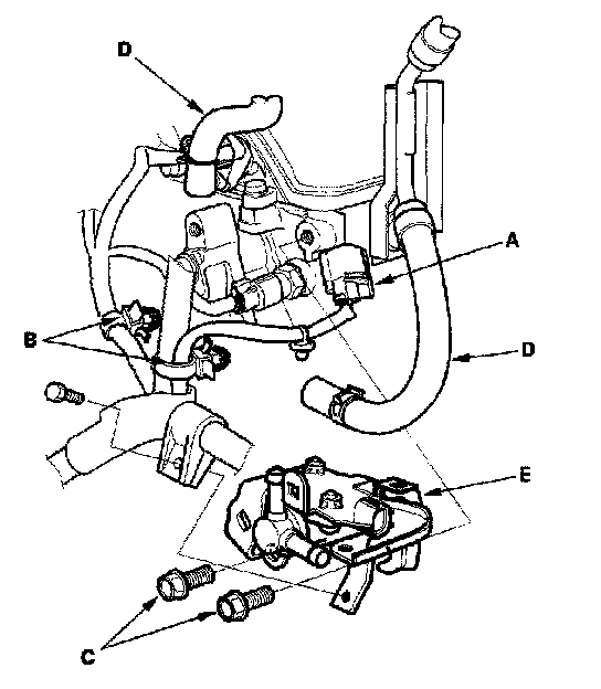 2. Remove the harness clips (B), the bolts (C), and the hoses (D), then remove the EVAP canister purge valve assembly (E).