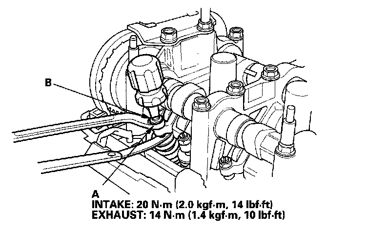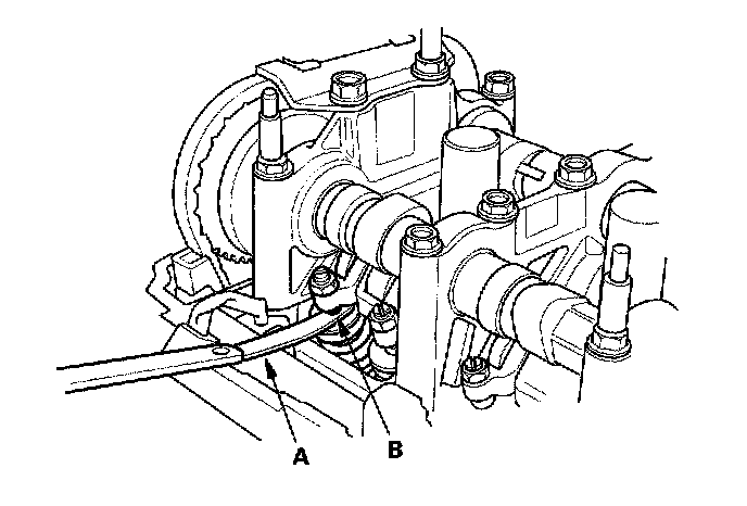 4. Insert the feeler gauge (A) between the adjusting screw (B) and the end of the valve stem, and slide it back and forth; you should feel a slight amount of drag.