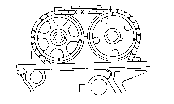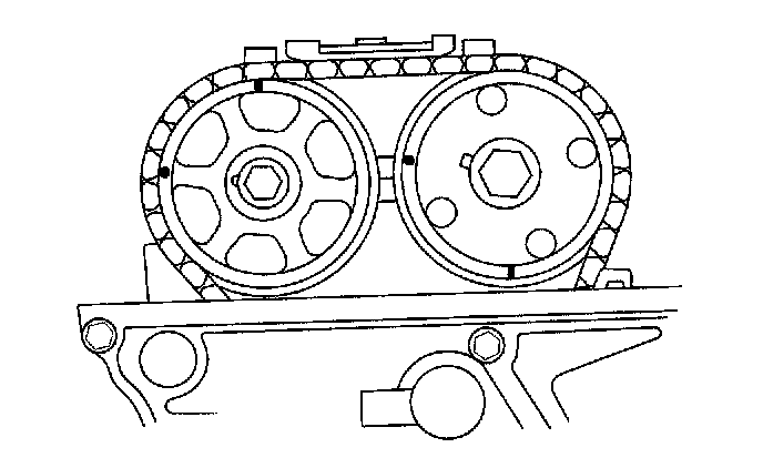2. Set the No. 1 piston at Top Dead Center (TDC). The punch mark (A) on the variable Valve Timing Control (VTC) actuator and the punch mark (B) on the exhaust camshaft sprocket should be at the top. Align the TDC marks (C) on the VTC actuator and exhaust camshaft sprocket.