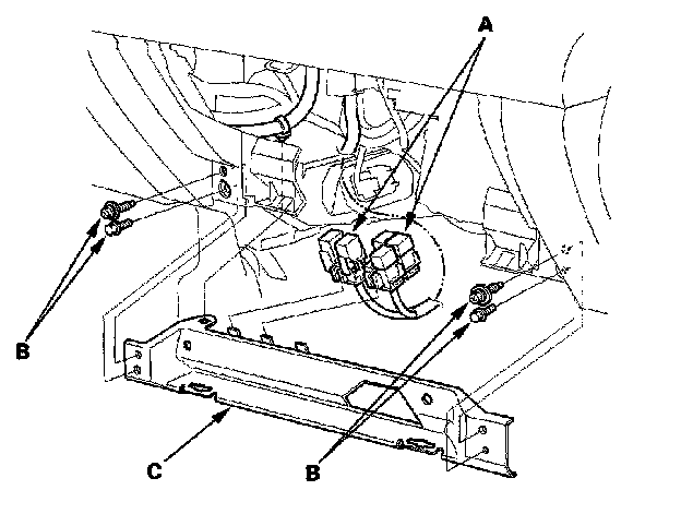 5. Remove the relays (A), then remove the bolts (B) and the glove box frame (C).
