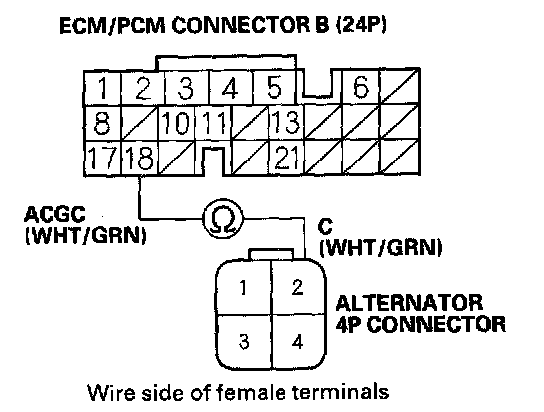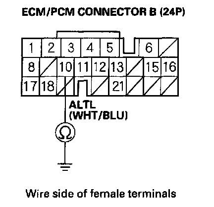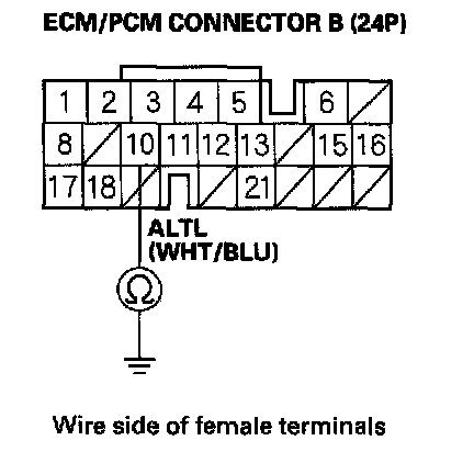 12. Check for continuity between ECM/PCM connector terminal B18 and alternator 4P connector terminal No. 2.