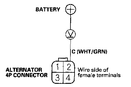 4. Measure voltage between alternator 4P connector terminal No. 2 and the positive terminal of the battery.