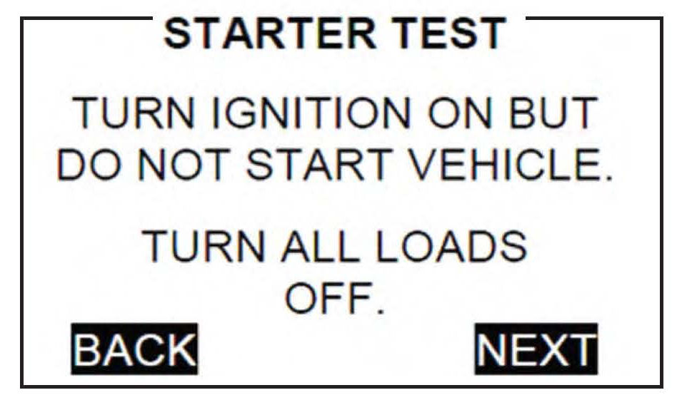 17. When prompted, turn the ignition switch to ON (II). Make sure all electrical loads are off at this time then press NEXT.