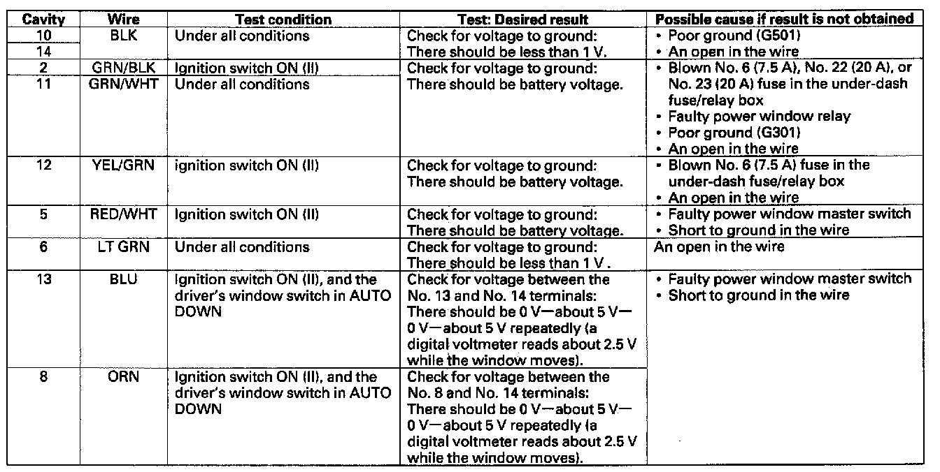 - If all the input tests prove OK, the control unit must be faulty; replace the power window master switch.