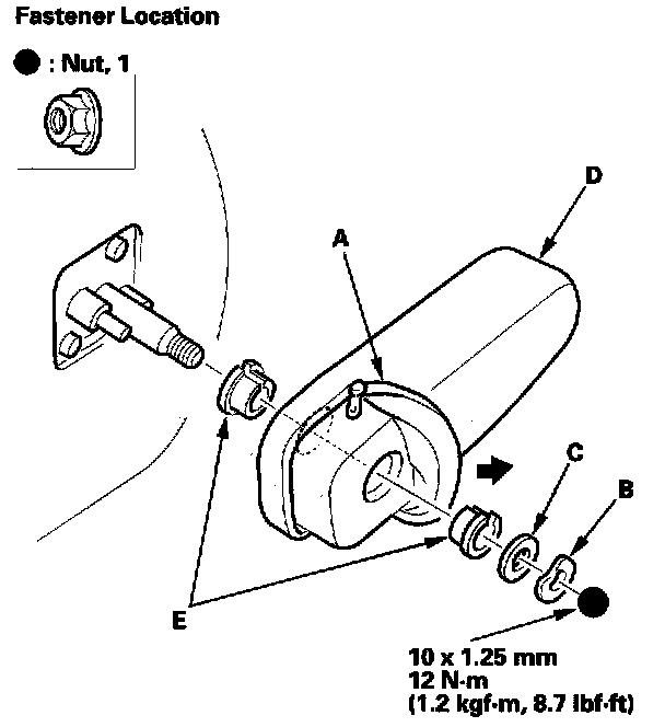 2. Remove the nut, the wave washer (B), and the washer (C), then remove the armrest (D). If necessary, remove the bushings (E) from the armrest.