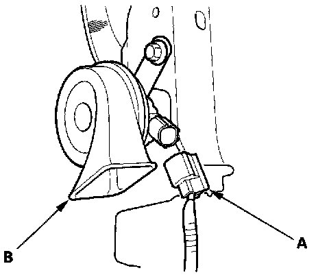 2. Disconnect the 1 P connector (A), and remove the horn (B).