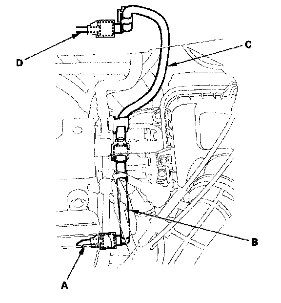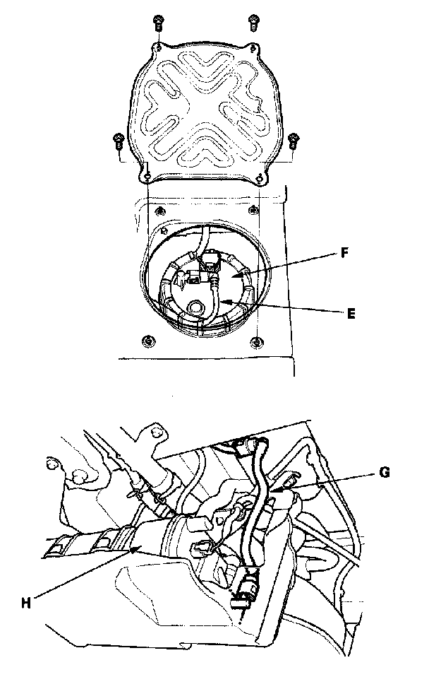 The fuel line/quick-connect fittings connect the fuel rail (A) to the fuel feed hose (B), the fuel feed hose (B) to the fuel feed hose (C), the fuel feed hose (C) to the fuel line (D), the fuel line (E) to the fuel tank unit (F), and the fuel vapor line (G) to the EVAP canister (H) When removing or installing the fuel feed hose, the fuel tank unit, or the fuel tank, it is necessary to disconnect or connect the quick-connect fittings Pay attention to these items: