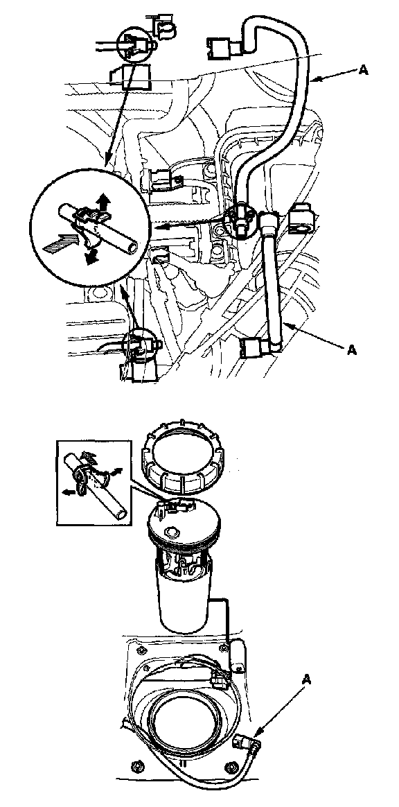 3. Before connecting a new fuel tube/quick-connect fitting assembly (A), remove the old retainer from the mating line.