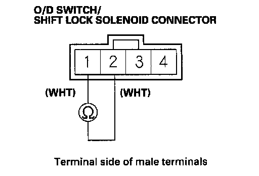 3. Check for continuity between O/D switch/shift lock solenoid terminals No. 1 and No. 2 while pressing the O/D switch and when the switch is released.