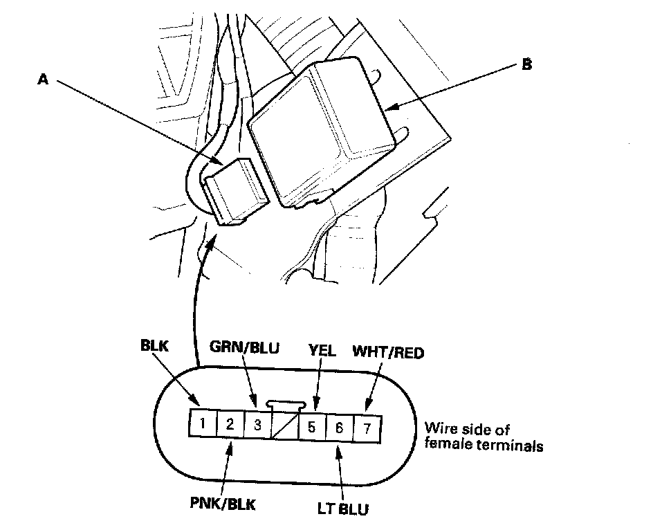 2. Disconnect the 7P connector (A) from the keyless receiver unit (B).