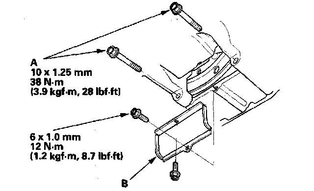 6. Tighten the two bolts (A) securing the transmission, then install the torque converter cover (B).