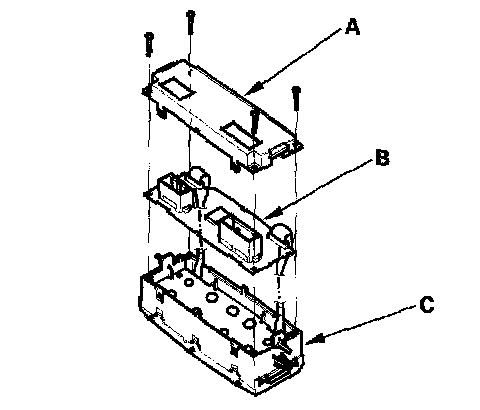 2. Remove the self-tapping screws, then carefully separate the climate control unit cover (A) and the control unit (B) from the control unit display (C). Do not kink or pull on the wires between the display and the control unit. Do not touch the electronic components on the printed circuit board in the control unit.