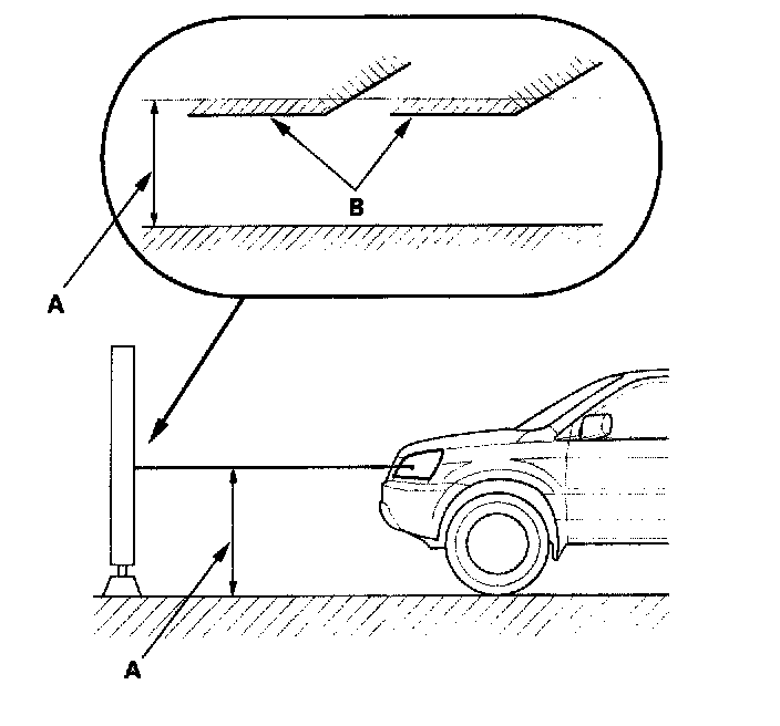 Measure the height of the headlights (A). The lights should reflect 52 mm (2.1 in) below headlight height (B).