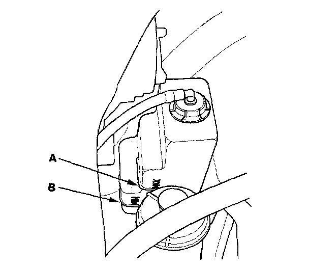 Coolant Check1. Look at the coolant level in the coolant reservoir. Make sure it is between the MAX mark (A) and MIN mark (B).