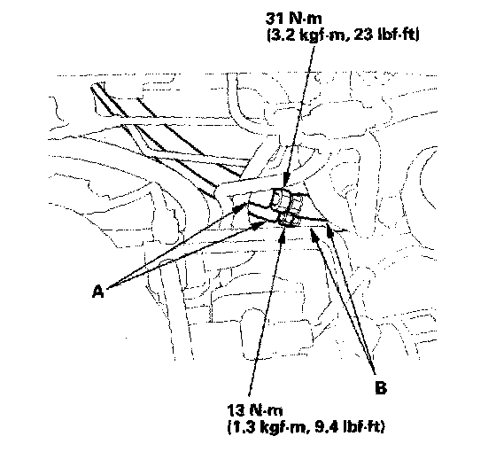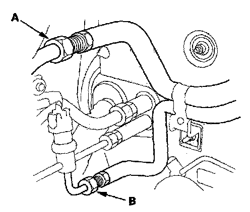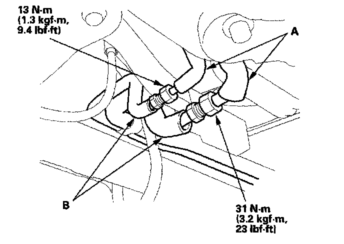 2. Route the upper replacement A/C lines along the engine compartment bulkhead, and loosely connect the upper lines (A) to the lower lines (B). Do not tighten the connections yet.
