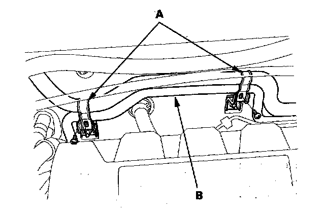 3. Remove the screws from the two clamps (A) along the engine compartment bulkhead, then free the rear A/C lines (B) from the clamps.