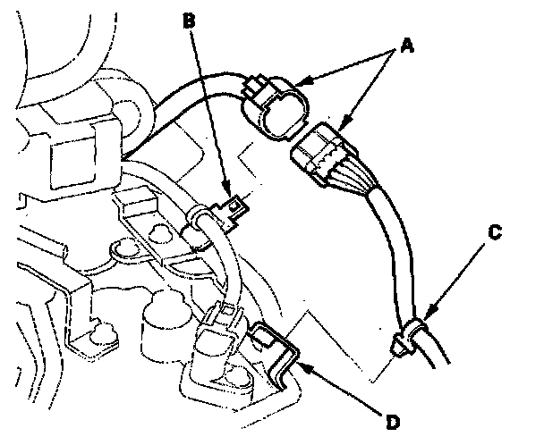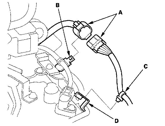 4. Remove the harness clamp (C) from its bracket (D).