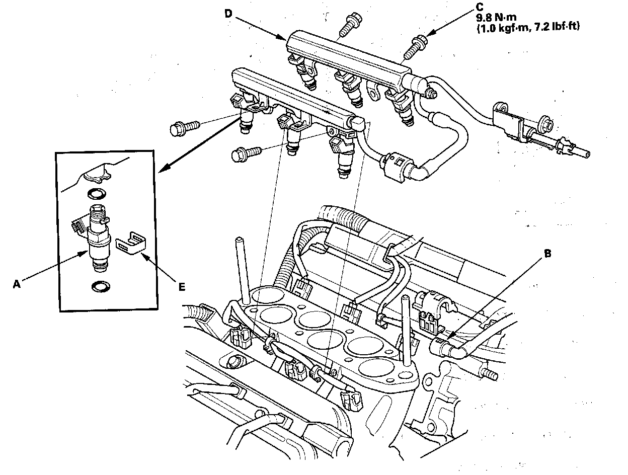 5. Remove the fuel rail mounting bolts (C)-from the fuel rail (D).