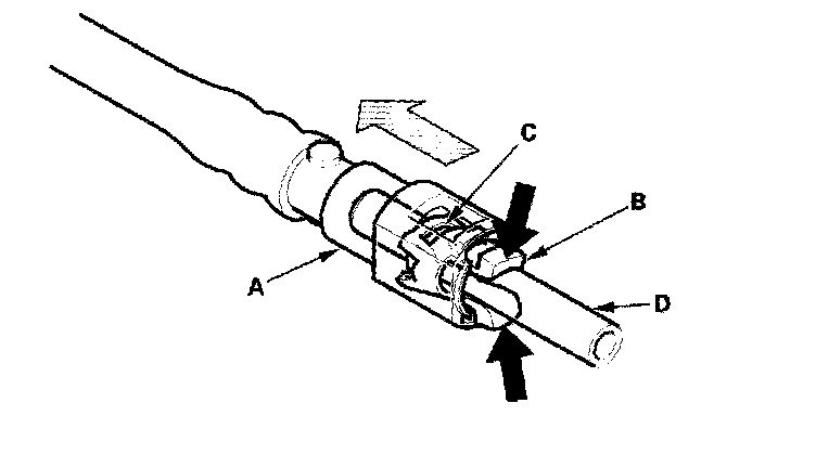4. Align the quick connect fittings with the line (A), and align the retainer locking tabs (B) with the connector grooves (C). Then press the quick- connect fittings onto the line until both retainer pawls lock with a clicking sound.
