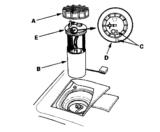 9. Align the marks (C) on the fuel tank (D) and the fuel tank unit, then install the fuel tank unit in the reverse order of removal with a new base gasket (E) and new locknut.