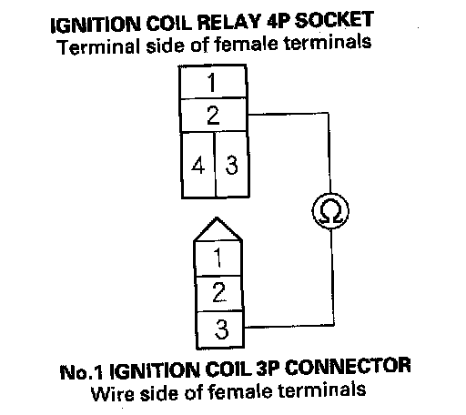 4. Check for continuity between ignition coil relay 4P socket terminal No. 2 and No. 1 ignition coil 3P connector terminal No. 3.