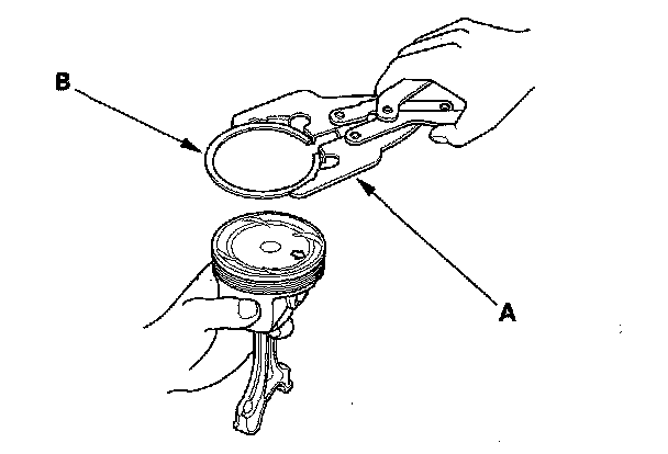 2. Using a ring expander (A), remove the old piston rings (B).