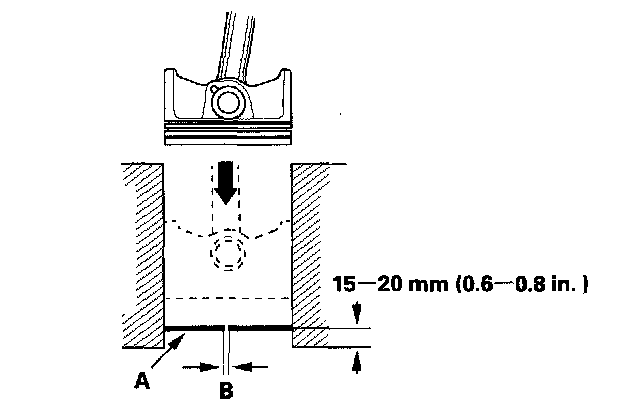 4. Using a piston, Push a new ring (A) into the cylinder bore 15 - 20 mm (0.6 - 0.8 inch) from the bottom.