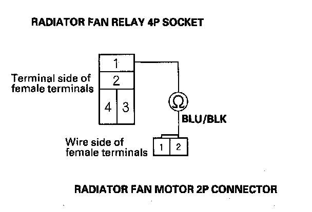 7. Check for continuity between radiator fan relay 4P socket terminal No. 1 and radiator fan motor 2P connector terminal No. 2.
