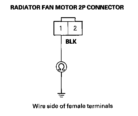 8. Check for continuity between radiator fan motor 2P connector terminal No. 1 and body ground.