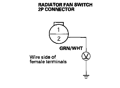 14. Remove the jumper wire, and measure the voltage between radiator fan switch connector terminal No. 2 and body ground.