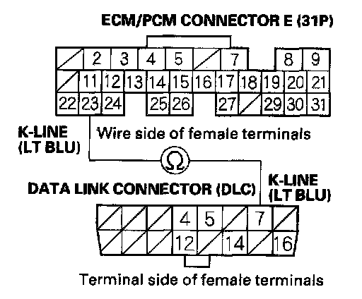 NO - Repair open in the wire between DLC terminal No. 7 and the ECM/PCM (E23). After repairing the wire, check for a DTC with the HDS, and go to the indicated DTC's troubleshooting.