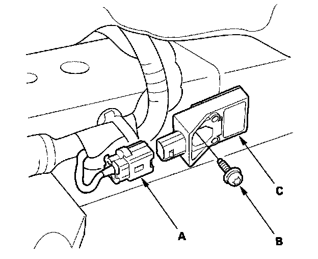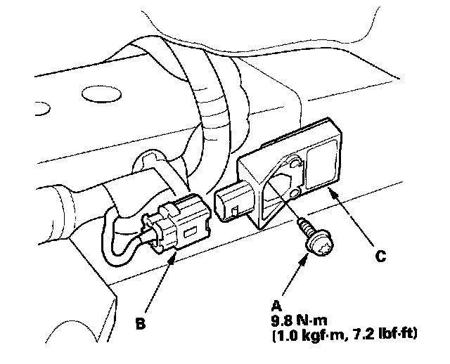1. Install the new roll rate sensor with a Torx bolt (A), then connect the floor wire harness 2P connector (B) to the roll rate sensor (C).