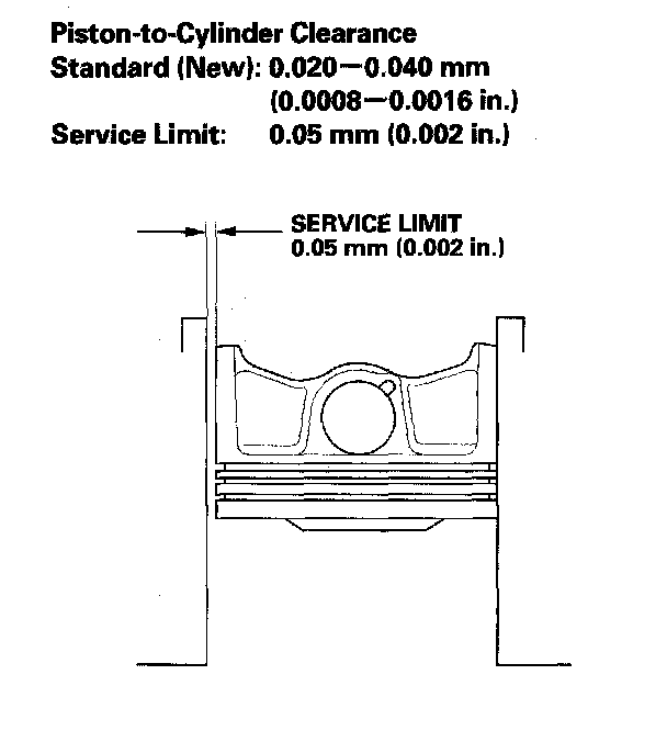 Cylinder Bore DiameterCalculate the difference between the cylinder bore diameter and the piston diameter. If the clearance is near or exceeds the service limit, inspect the piston and engine block for excessive wear.