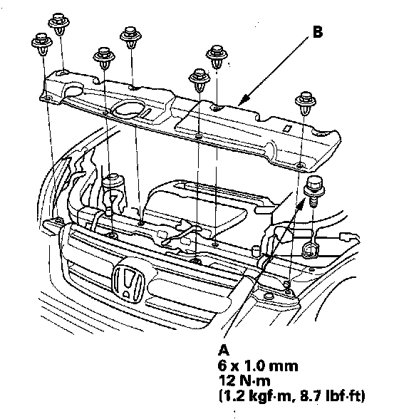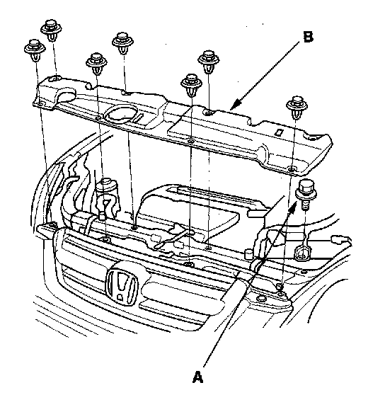 3. Remove the bolt (A) securing the battery clamp, then remove the bulkhead cover (B).