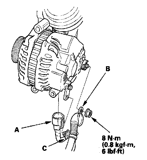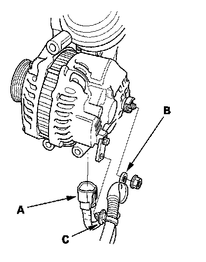 8. Disconnect the alternator connector (A) and BLK wire (B), and remove the harness clamp (C) from the alternator.